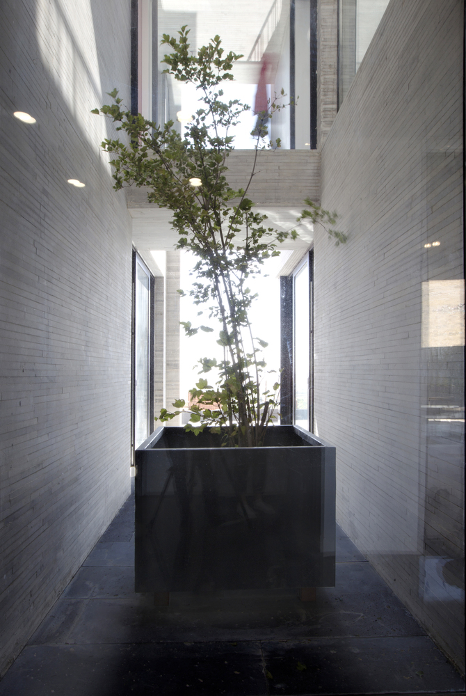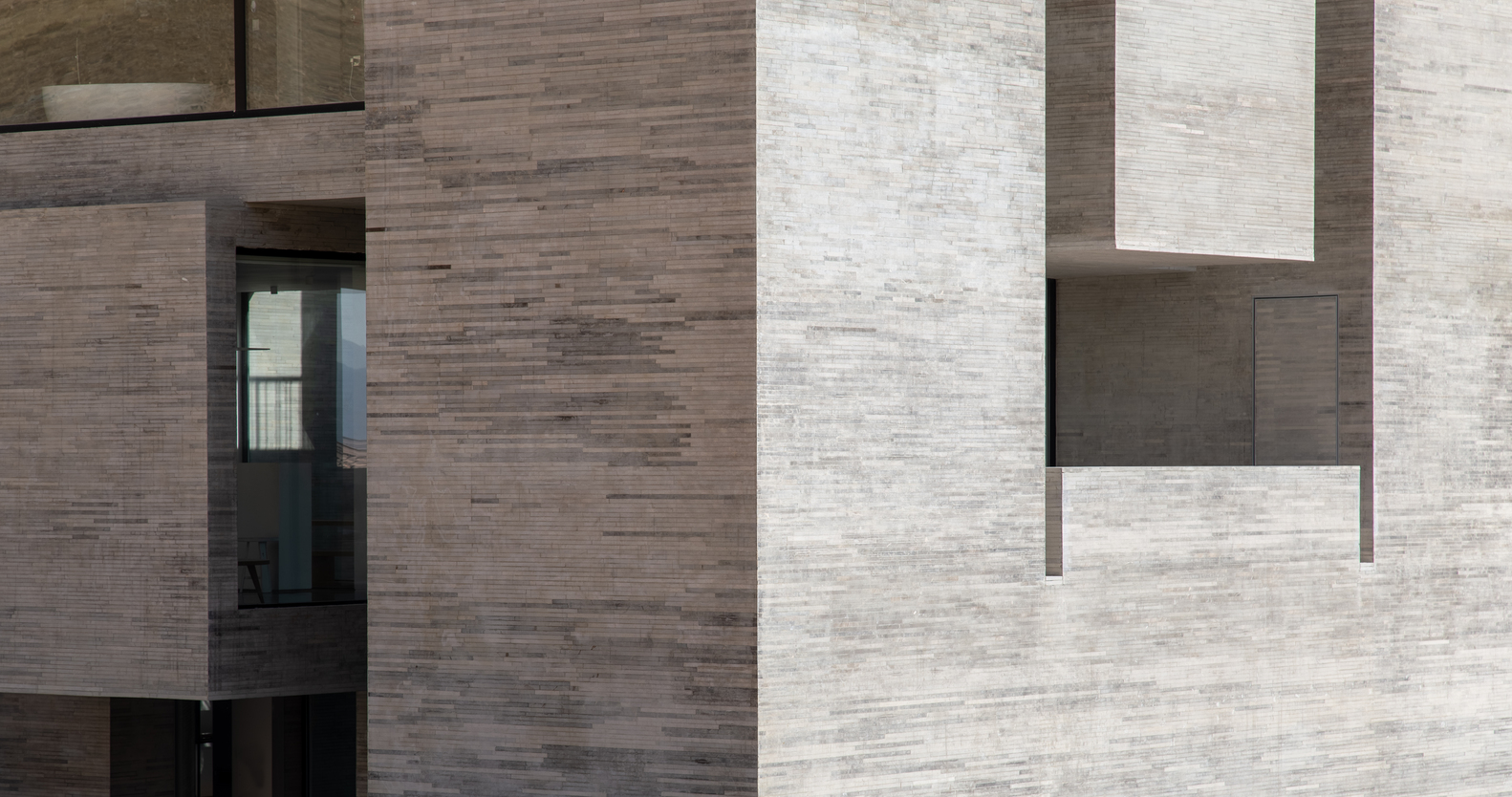 “魔方”堡建在美麗的山坡與田園之間,做舊的清水混凝土建筑與自然田園創(chuàng)新融合,形成一道靚麗的風(fēng)景線。建筑的外墻表皮呈現(xiàn)出一道道深淺不一的線條,賦予建筑神秘而又堅不可摧的“魔方”堡。