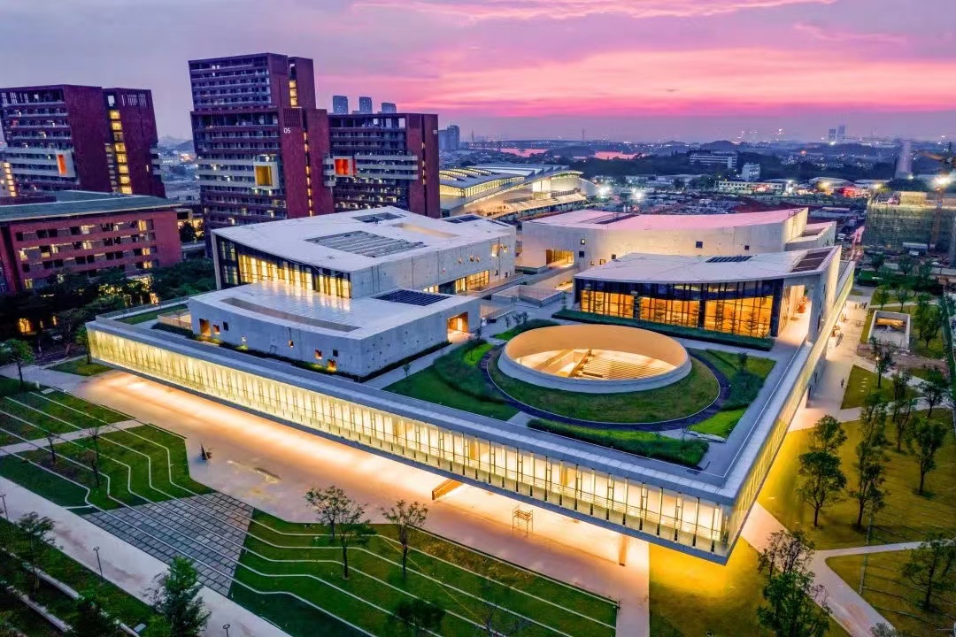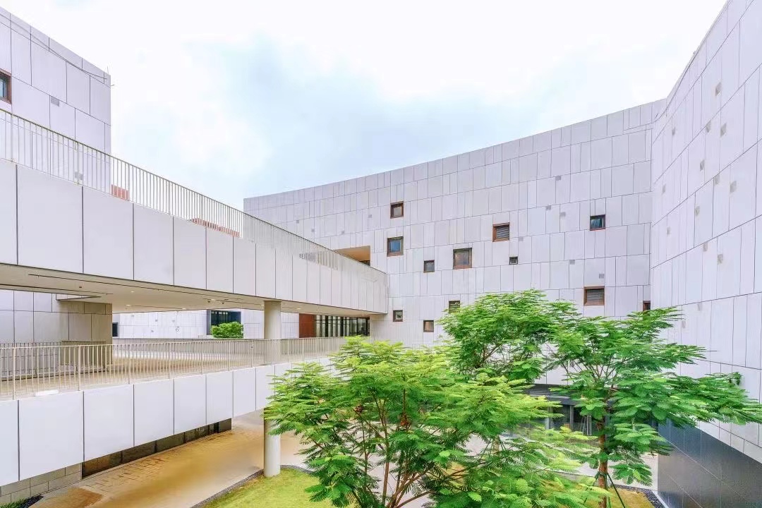 華南理工大學廣州國際校區(qū)項目是國家、省級重點項目,國際校區(qū)圖書館工程總建筑面積為52200平方米,分為地下一層地上五層,為現(xiàn)澆鋼筋混凝土框架、屋面鋼結構,采用290的外傾斜造型、砼創(chuàng)UHPC清水混凝土掛板、超高超大跨度、“Z”字型屋架鋼梁等高難度結構形式。