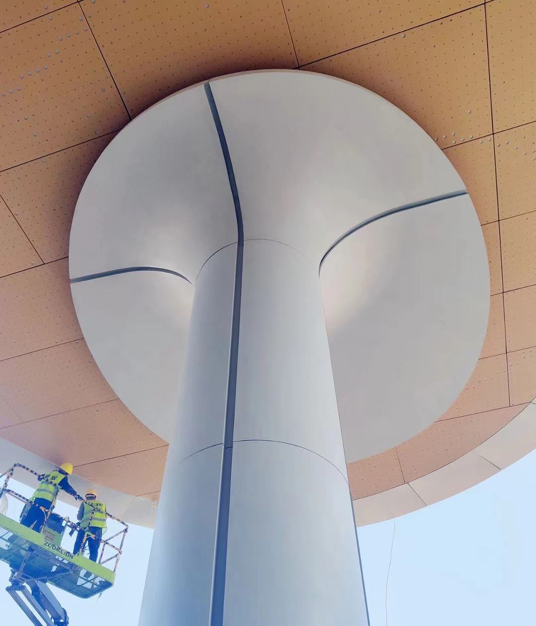 得益于UHPC優(yōu)異的材料屬性,能制作大規(guī)格及大異型的預(yù)制構(gòu)件,為建筑幕墻裝飾行業(yè)帶來了更多的可行性。完工后的柱體造型流暢,美觀獨特,現(xiàn)代輕奢。窄橫縫、寬豎縫的建筑成品更給人視覺上”無橫縫“的效果。UHPC表面質(zhì)地細(xì)膩,讓其融入水景,與水面景觀相輔相成,互相促進(jìn)。